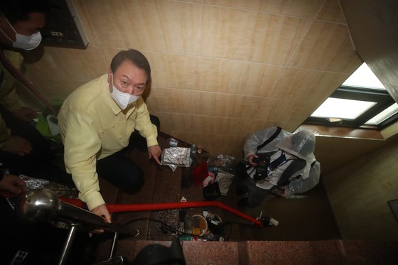 이 이상 현장에 다가갈 수는 없다는 공무원의 제지를 받으며 윤은 끌려나오다시피 그 계단을 벗어나 건물 밖으로 인도되었다. 사실 이제 용건은 더 없었지만, 아직 그들은 정말 보고 싶은 것을 보지 못한 상태였다. 특히 윤의 입장에서는, 그 세 사람이 실제로 죽어가던 그곳의 정취를 아직 제대로 느껴보지 못했기 때문에, 다소 무리를 하더라도 그 반지하방 안을 볼 방법이 있는지 찾고 싶었다. 아마 윤이 '창문으로 탈출 못하나?' 같은 멍청해 보이는 질문을 해서 유도를 받았던 것 같은데 아무튼 그렇게 오와 윤은 그 창문 앞으로까지 안내를 받았다. 그들의 얼굴이 그 창문 앞에 다다랐다. 그들은 눈을 크게 뜨고 그 어둠을 들여다보려고 했다. 들여다보여지는 저편 방향에서는 역광에 비친 그들의 몸뚱아리 그림자가 불쑥 나타났고, 그 속에서마저 그들의 퍼런 안광이 번뜩였을 것이다.